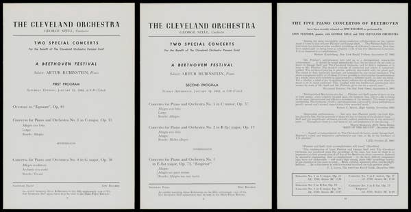 Some of these industry shifts are apparent in the history of these concertos at The Cleveland Orchestra. Szell and Fleisher recorded the Fourth Concerto in 1959, and it was released that same year by Epic. Two years later Fleisher returned and recorded the other four concertos with the Orchestra in one weekend in October. Epic then released these recordings as a complete set with the re-release of the earlier recording of the Fourth. Between and after these two recording sessions, Fleisher performed and toured with the Orchestra, which served to build the synergy between soloist and group and to drum up interest for future record sales — but there was no attempt to advertise the fact that audiences may have the opportunity to hear all five concertos in one season. When Rubinstein offered all five at the Pension benefit concert, it was also advertised in relation to the recording. In fact, there were no program notes for Rubinstein’s concerts, just a list of the pieces, and a full-page advertisement for the Fleisher-Szell recordings.