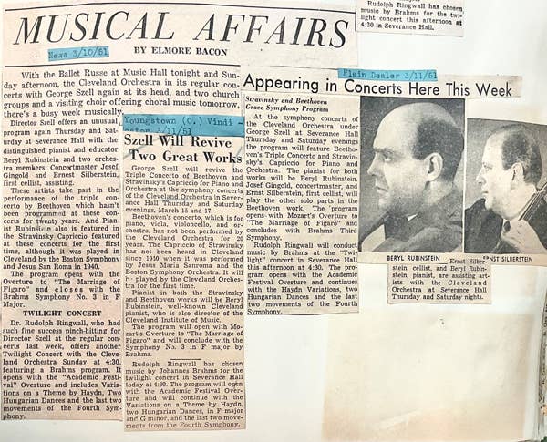 On March 10, 1951, Elmore Bacon of The Cleveland News noted in a concert preview that the Orchestra would be performing “the triple concerto of Beethoven which hasn’t been programmed at these concerts for twenty years.” A Youngstown paper titled their preview “Szell Will Revive Two Great Works,” referring specifically to the Triple Concerto and Stravinsky’s Capriccio for Piano. This much anticipated return of the Triple Concerto to Cleveland’s concert hall was performed by Cleveland-based pianist Beryl Rubinstein, Concertmaster Josef Gingold, and Principal Cellist Ernst Silberstein. In his subsequent review, Bacon said, “we are indebted to Szell for reviving it,” and went on to praise Szell’s “virtuosity in welding orchestra and soloists together,” making sure to note “Concertmaster Gingold’s suavity of tone and wealth of expression” and Silberstein’s “fluency and fine technical prowess,” while saving his praise of Rubinstein for his performance of the Stravinsky. Reminiscent of the 1928 reviews, Herbert Elwell of The Plain Dealer finds the work “less than Beethoven’s best,” but like Bacon he commends the “artful display passages which were rendered with great skill and beauty by all three soloists.” Pianist, scholar, and critic Arthur Loesser wholeheartedly concurred, writing in The Cleveland Press, “the concerto must be written down as considerably less than a masterpiece; nevertheless it contains a number of agreeable passages, and it gave opportunity for some fine, neat, fluent, well-balanced, altogether expert ensemble playing on the part of the soloists.”