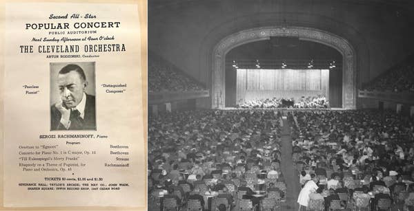 Loesser also reviewed the first performance of Beethoven’s First Piano Concerto with The Cleveland Orchestra a decade earlier in 1941. It was not a subscription concert, but one of the special All-Star Concerts offered at Public Auditorium, designed to entice a wider audience with cheaper tickets in a larger space. This performance was especially exciting because the featured soloist was 67-year-old Sergei Rachmaninoff, by then a world-renowned composer and conductor. There was plenty of hype leading up to the concert surrounding this famous guest — the fact that the Beethoven would be a first performance was also touted in many previews — and the reviews after the fact were equally exuberant.