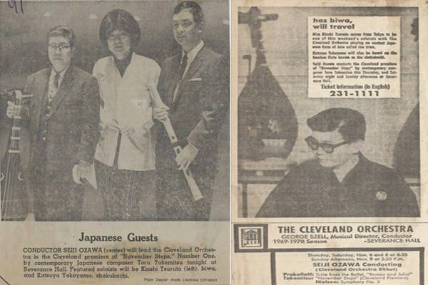 Two years later, Ozawa programmed November Steps for his guest conducting debut with The Cleveland Orchestra. The original soloists, Kinshi Tsuruta (biwa) and Katsuya Yokoyama (shakuhachi), also came to Severance for these November 1969 performances.