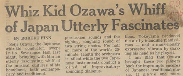 Ozawa’s efforts paid off, because the novel soundscape of November Steps was greeted with generally favorable reviews by the Cleveland press. The Sun Press praised the unfamiliar yet “far-out” sounds of the biwa and shakuhachi, while Robert Finn of The Plain Dealer observed that Ozawa brought “an utterly fascinating whiff of the musical cultures of his homeland, both contemporary and traditional.” Indeed, this program presented a special opportunity for Cleveland audiences to experience the musical atmosphere of Takemitsu’s native Japan. According to the Archive’s records, these concerts marked the first and only time that a biwa and shakuhachi have ever been heard with the Orchestra.