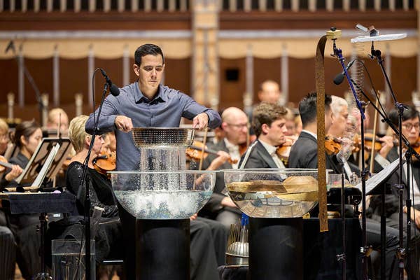 The Cleveland Orchestra welcomed Tan Dun to Severance early in the 2024–25 season. His inaugural guest conducting appearance coincided with the ensemble’s first performances of his Water Concerto (1998) and Concerto for Orchestra (from Marco Polo) (2012). Principal Percussionist Marc Damoulakis was the featured soloist on Water Concerto which employed a staggering assortment of hemispherical water basins, water drums, water gongs, water tubes, agogo bells, waterphones, mallet percussion, water shakers, slapsticks, and a sieve. Although playing with such equipment is highly unusual for Western orchestras, using organic materials is a hallmark of Tan Dun’s compositional style.