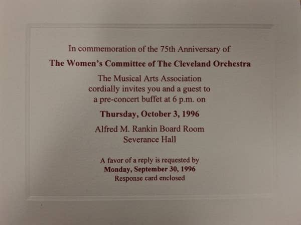 Though the breadth of the WCCO’s responsibilities had diminished, the 1990s and 2000s were an era of renewed recognition for its importance in the history of the Orchestra. In 1996, the Women’s Committee was on the receiving end of an elaborate banquet, as the MAA put on a dinner celebrating 75 years of invaluable service to the Orchestra. That same year, Dorothy Humel Hovorka, president of the Committee from 1969–71, received the first ever Cleveland Orchestra Distinguished Service Award.