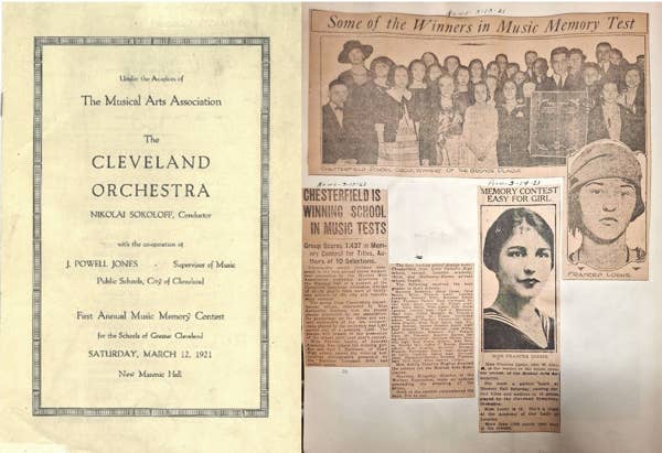 The first major event sponsored by the WCCO in 1921 was the Music Memory Contest. This competition was designed for school teams to compete against each other by recognizing details about classical music covered by their school curriculum. The contest itself featured pieces performed live by The Cleveland Orchestra. While the contest papers were graded by volunteers, the Orchestra played a short concert. It was immediately clear that parents were also interested in participating in the contest, so an adult division was created for future years, in connection with community music appreciation classes and lectures. The contest was so successful that it lasted well into the 1960s (with phonograph recordings eventually replacing live performances), and the adult music appreciation groups continued for nearly a century, until the COVID-19 pandemic.