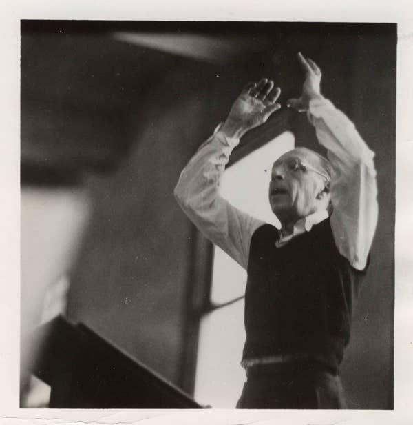 I saw Monsieur Stravinsky conduct a rehearsal at Masonic Hall Tuesday afternoon. He was there in the famous orange sweater, immaculately groomed, looking very much the suave, polished frequenter of continental drawing rooms, and exhibiting little of the artistic temperament generally expected of such a figure. He has a novel way of presiding over a rehearsal. Swift, concise strokes mark the beat, while he rises on his toes to accentuate a rhythm, pirouetting on one foot oftentimes, like a ballet dancer. Occasionally, in a fortissimo passage, he jumps into the air, landing on both feet with a heavy thud, humming meanwhile in a loud voice.