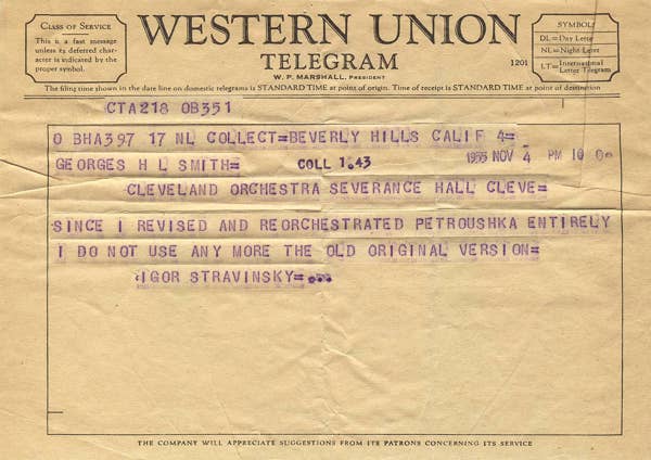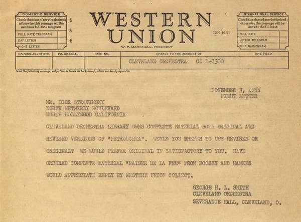 After the success of the Pétroushka scene in Cleveland, Stravinsky returned at the invitation of The Cleveland Orchestra to conduct the full score of Pétroushka eight years later, in 1955. He was adamant about using the revised 1947 version of the score rather than the original: when the Associate General Manager of The Cleveland Orchestra proposed using the 1911 version of the ballet for the Cleveland performances of the work, Stravinsky replied, “Since I revised and reorchestrated Pétroushka entirely, I do not use any more the old original version.”