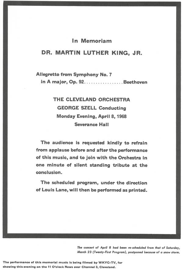 Though King was considered by some to be a controversial figure at the time of his death, The Cleveland Orchestra and its music director, George Szell recognized the power of King’s words and actions early on. On April 8, 1968, just a few days after King’s death, Szell led the Orchestra in a special performance of the Allegretto from Beethoven’s 7th Symphony, to be followed by a minute of silence in honor of King. Though Szell would pass away in 1970, a decade before consistent homages to King began, he planted an undeniable seed of support for the civil rights paragon and connection to Cleveland’s community.